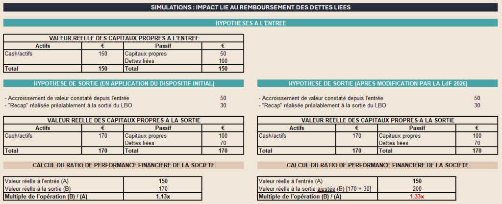 Lors de notre premier article sur ce régime spécifique d’imposition, nous avions alerté sur le sujet d’une « insuffisance » de la loi de finances pour 2025 qui ne prévoyait pas expressément que la valeur réelle de la société prise en compte à la sortie devait corrélativement être ajustée du montant des éventuelles opérations de « recap ». Or, de telles opérations étaient susceptibles d’entraîner une minoration relativement artificielle du ratio de performance financière de la société, en contradiction avec l’esprit du dispositif, qui consiste précisément à mesurer le multiple « projet » globalement réalisé par les investisseurs sur la période de détention des titres.