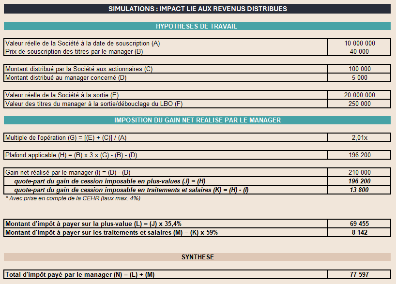 En définitive, ce mécanisme présente une certaine cohérence en ce qu’il permet d’apprécier la performance globale de l’opération pour la détermination du Plafond, tout en réduisant celui-ci à concurrence des sommes déjà perçues avant la sortie et soumises au prélèvement forfaitaire unique (ou flat tax). Il conduit ainsi, in fine, à mesurer le gain net effectivement réalisé par le salarié ou le dirigeant en agrégeant l’ensemble des produits perçus sur la période de détention des titres.